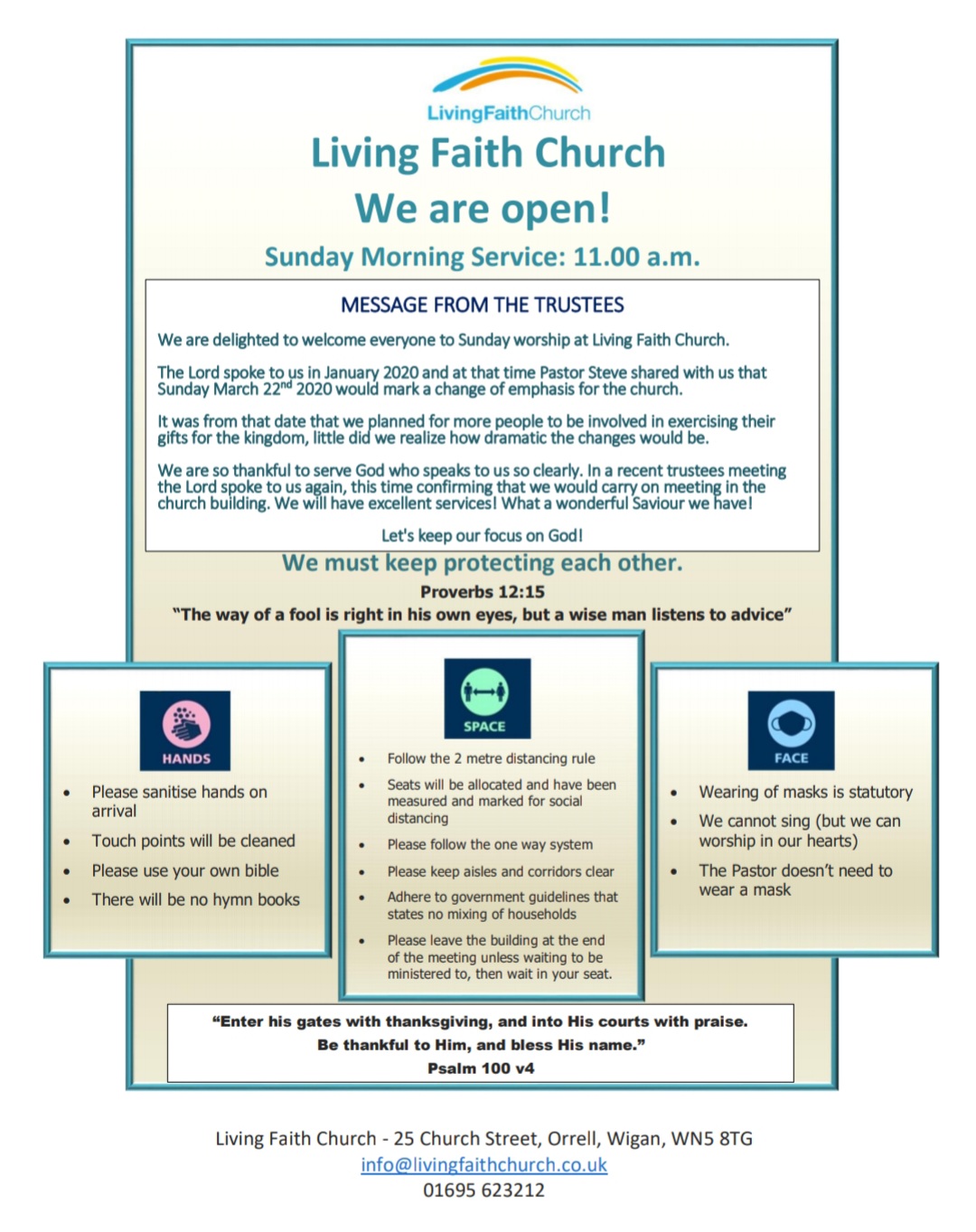 The church remains open during the lockdown, to enable us to stay open we've implemented measures following government guidelines. Below is an outline of the measures.
